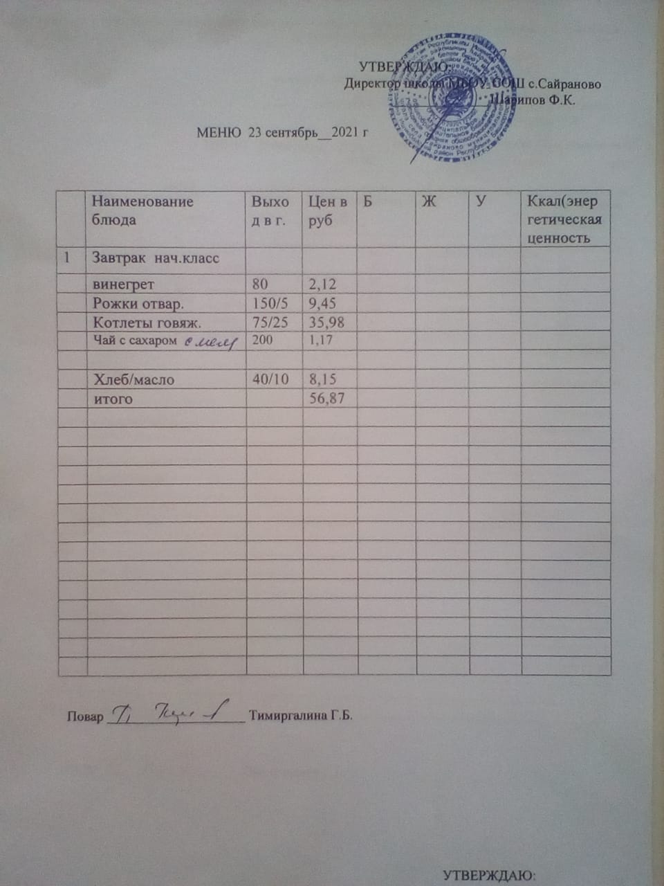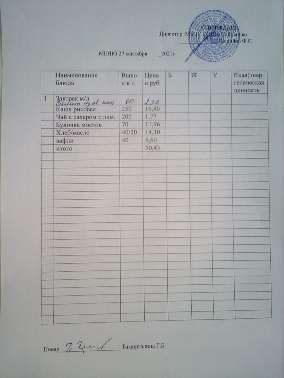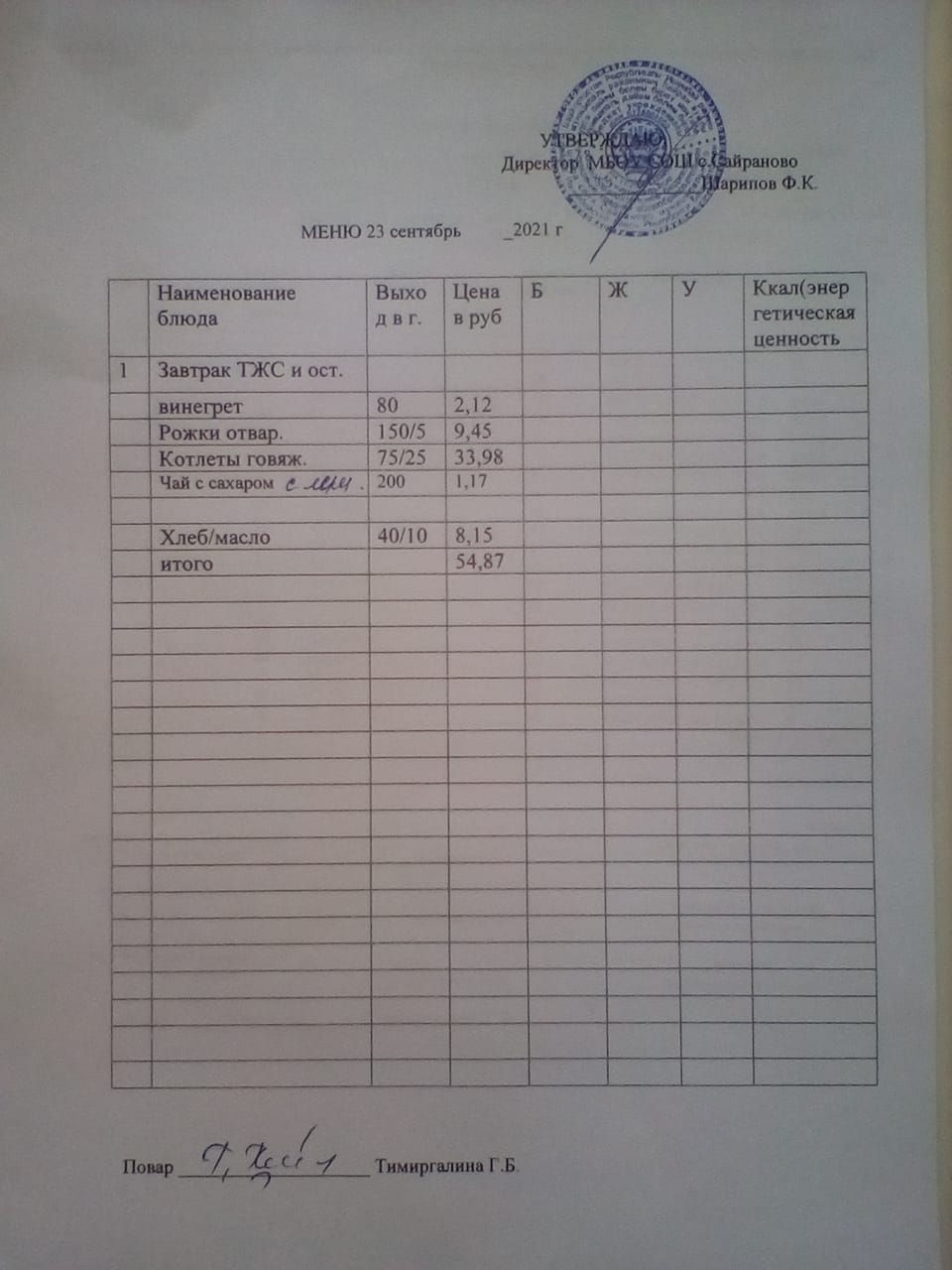 Стоимость школьного питания