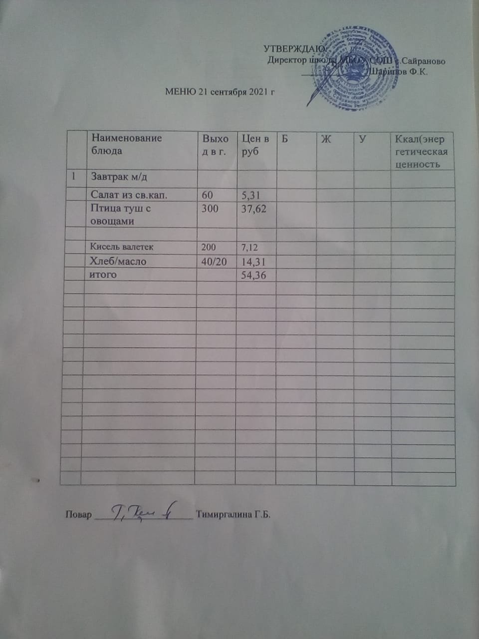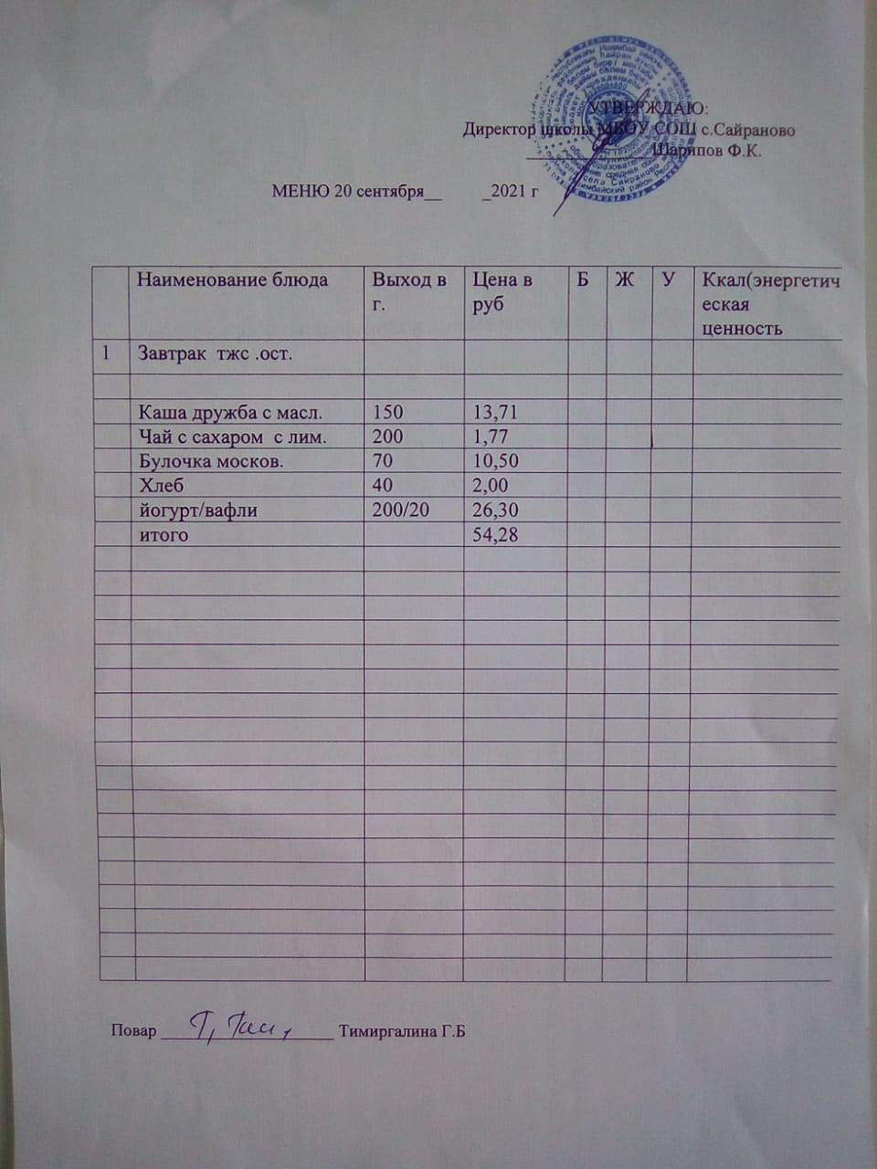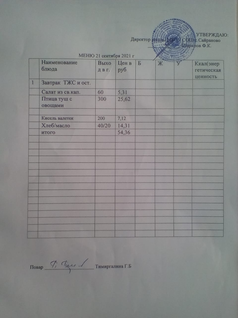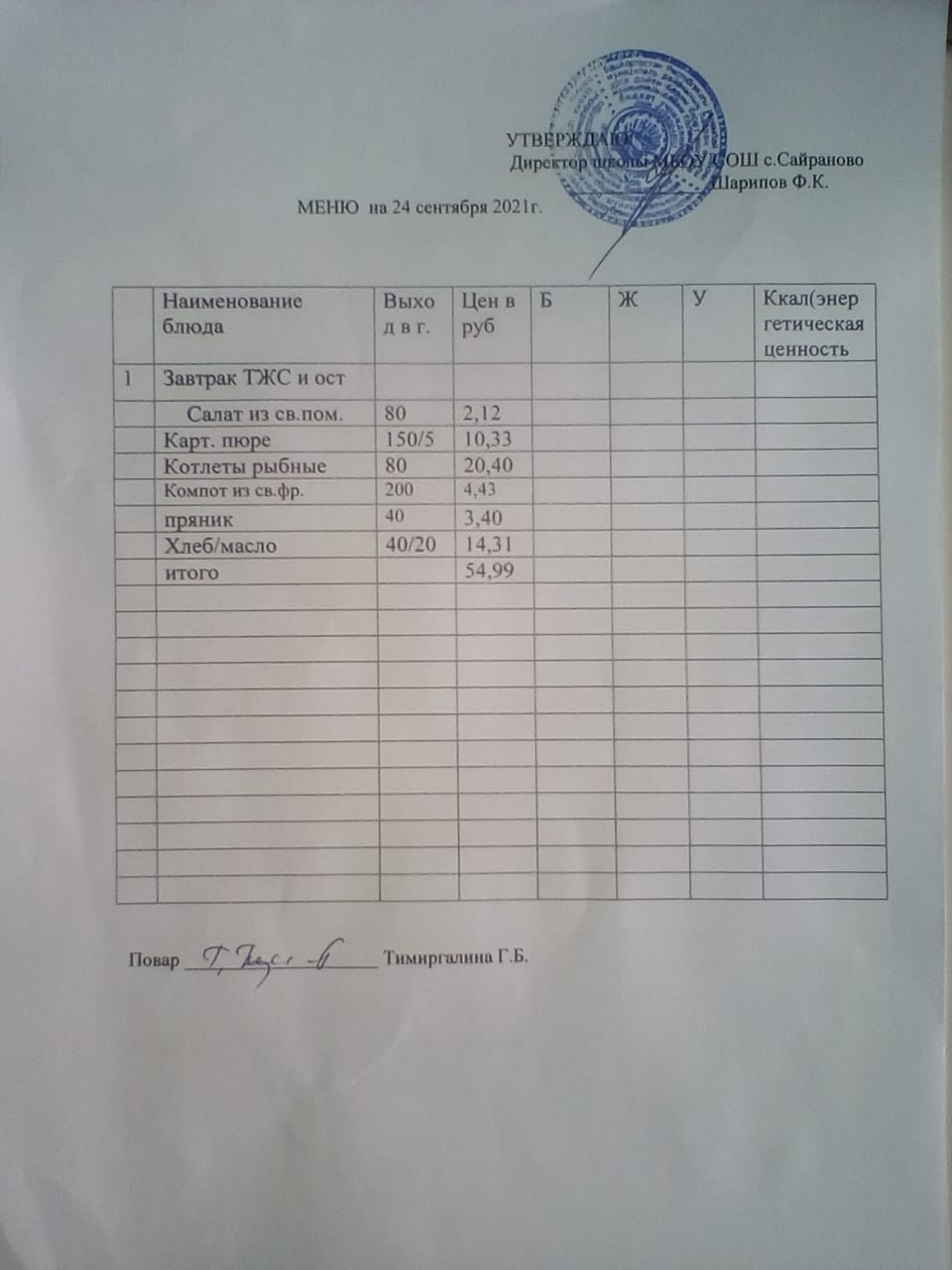 Паспорт пищеблока