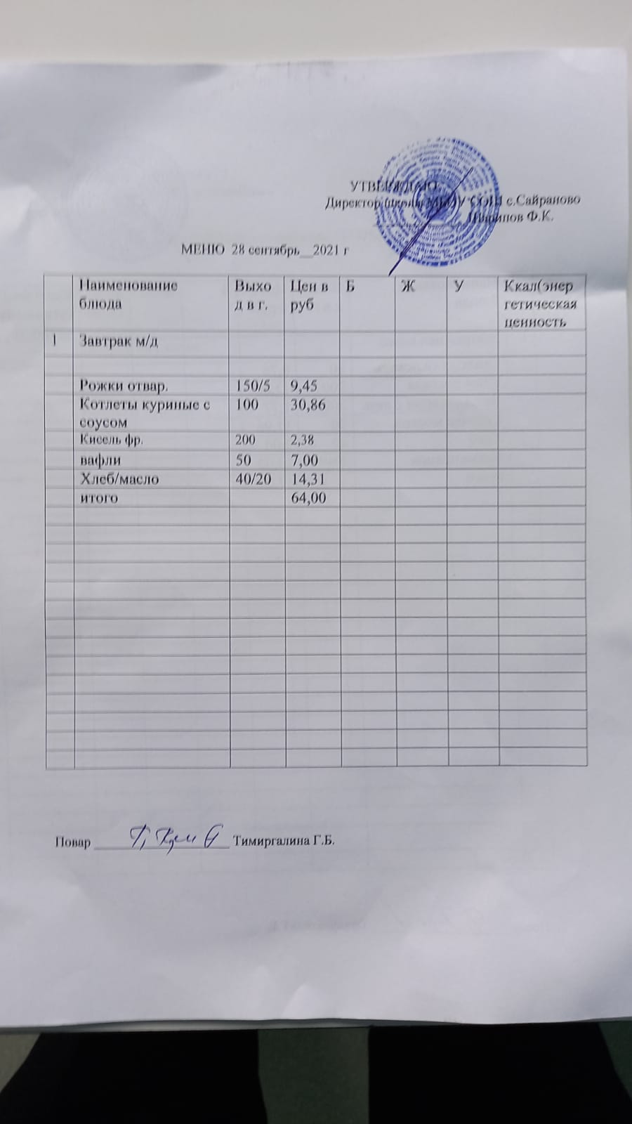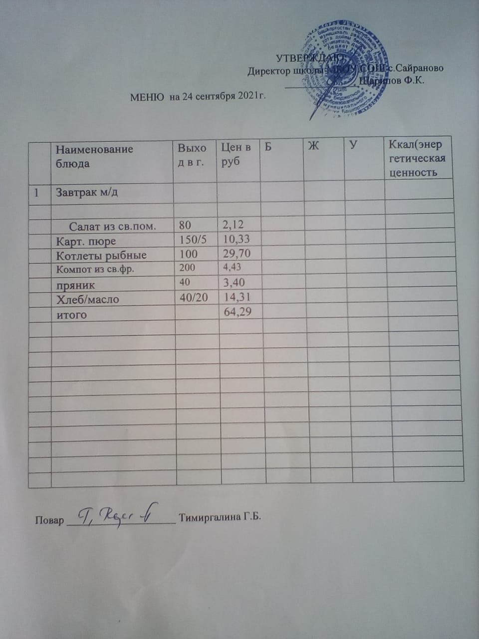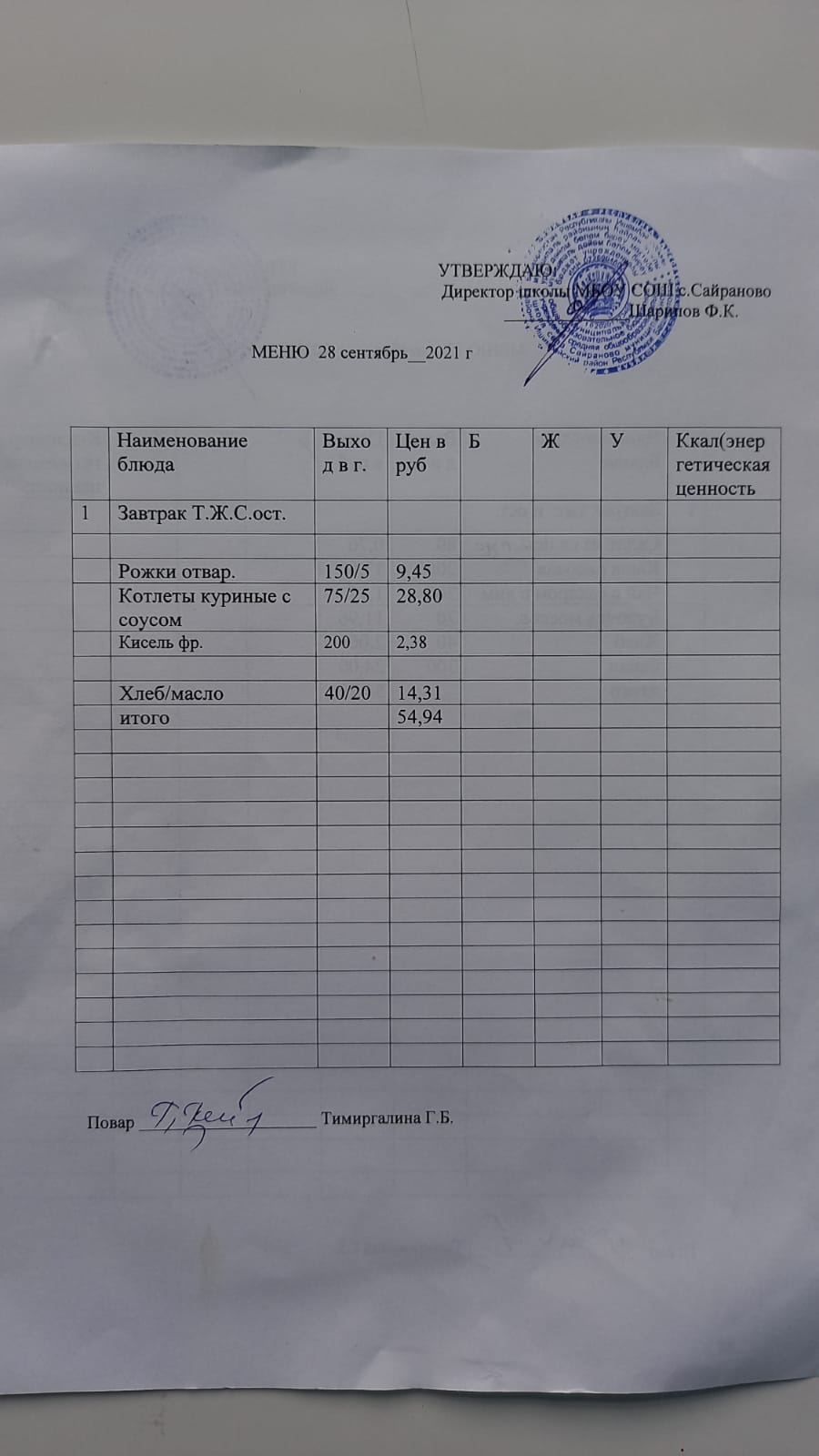 Паспорт пищеблока