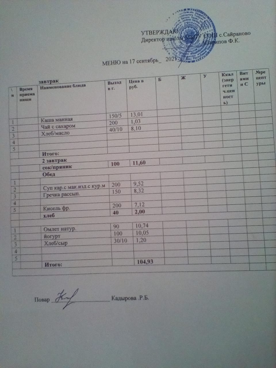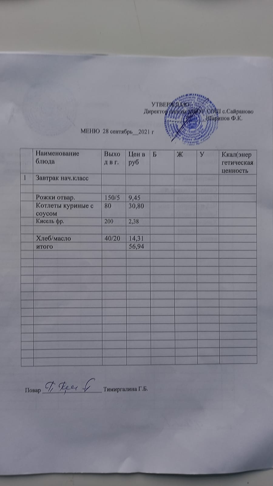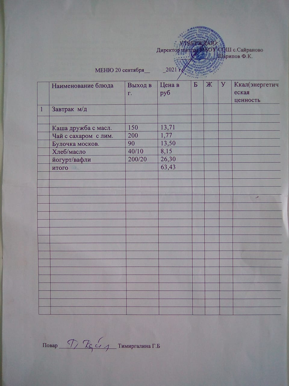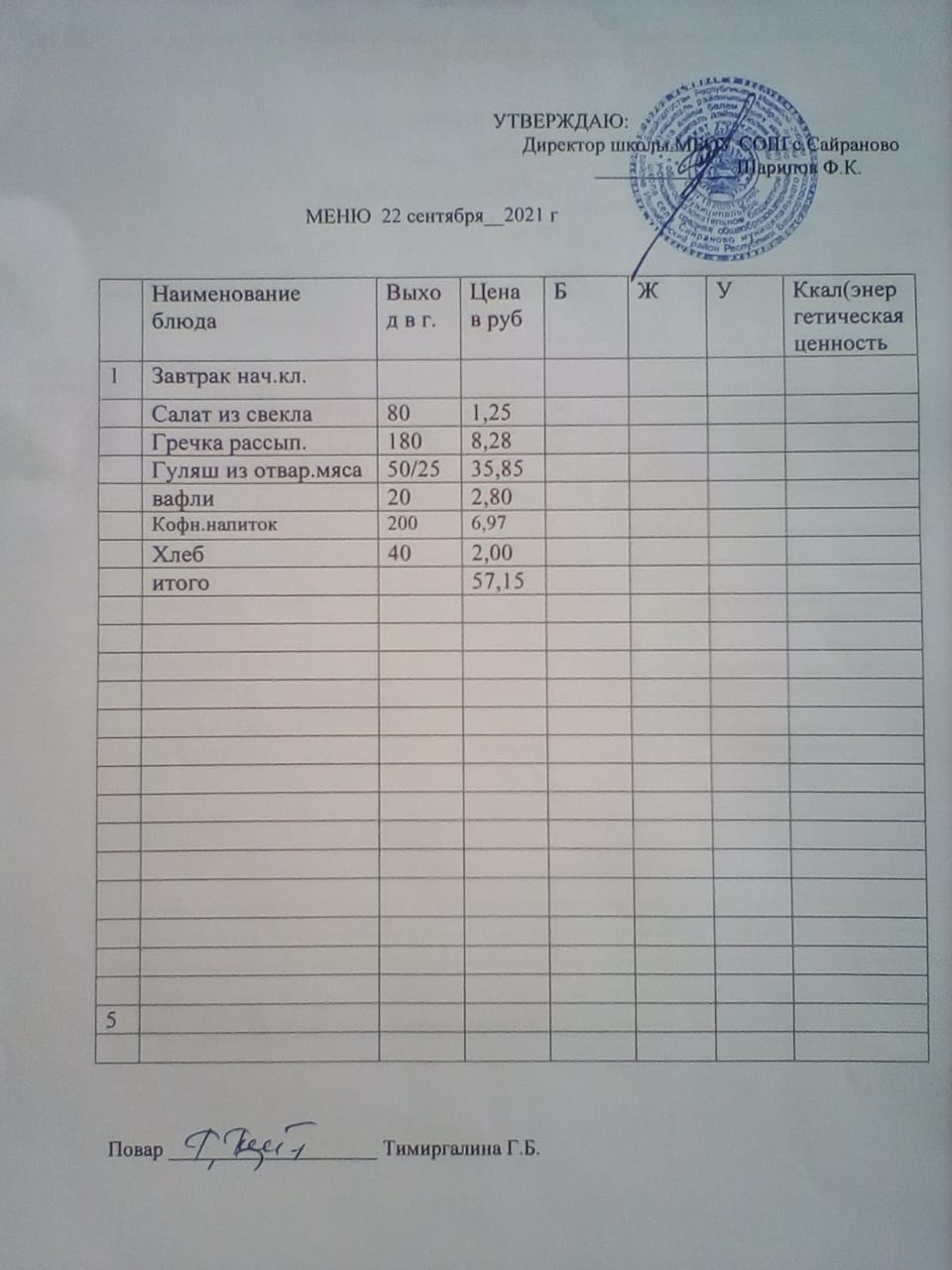 Паспорт пищеблока